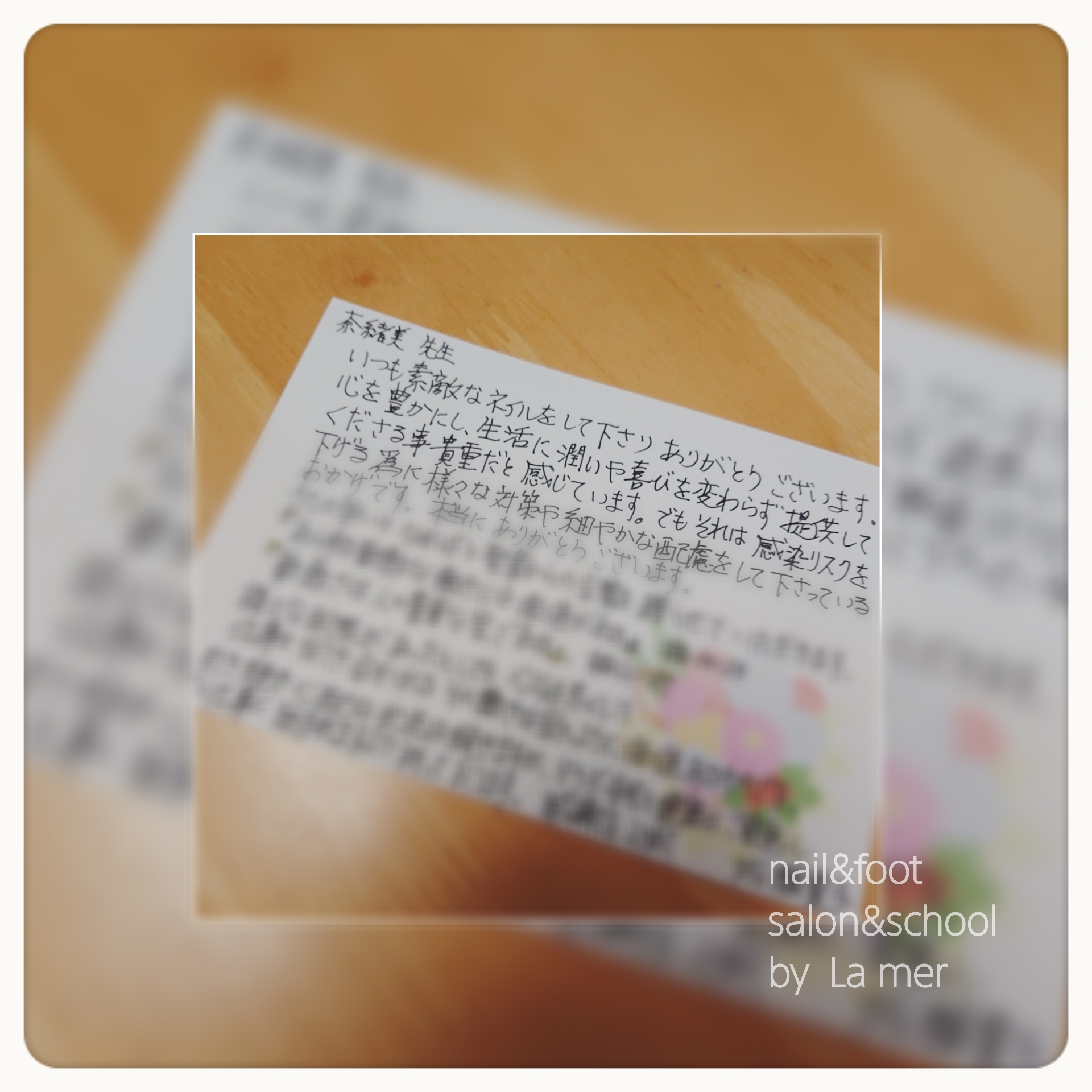 初めてご来店していただいてから長い年月が過ぎましたが、毎回楽しいお話を聞きながらの手や足のお手入れをさせていただく時間が楽しく私の方が感謝しております。